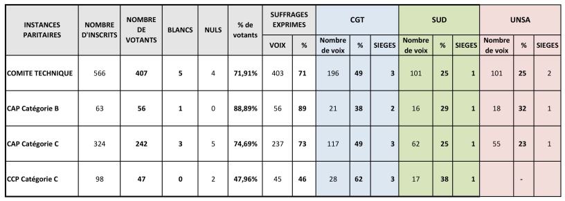 - 62% des voix des agents contractuels en catégorie C (CCP), soit 28 voix,
